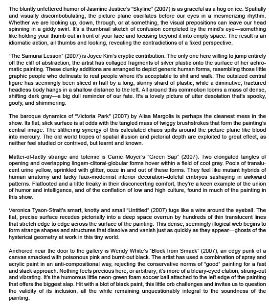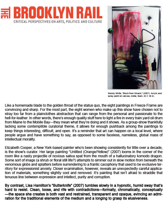 Craig Olsen, "Freeze Frame, Thrust Projects ", The Brooklyn Rail, Art Seen, March, 2008, pg. 50-51.
